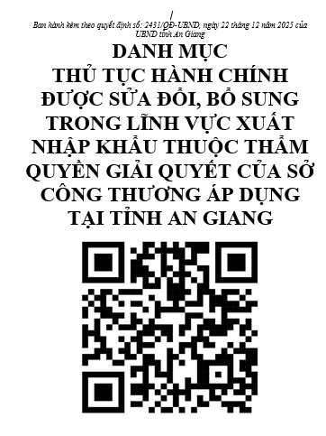 aA Danh mục Quyết định số 2431/QĐ-UBND NGÀY 22 THÁNG 12 NĂM 2025 CỦA UBND TỈNH AN GIANG 13/01/2026, 14:59 Quay về Chia sẻ Z Copy link thành công Tin khác Quyết định số 488/QĐ-UBND, ngày 04 tháng 02 năm 2026 của UBND tỉnh an giang về Danh mục TTHC lĩnh vực Văn hóa Cơ sở về Di Sản Văn Hóa Danh mục 21/02/2026 Quyết định số 523/QĐ-UBND, ngày 06 tháng 02 năm 2026 của UBND tỉnh an giang về Danh mục TTHC mới ban hành lĩnh vực Di Sản Văn Hóa thuộc Sở Du Lịch Danh mục 21/02/2026 Quyết định số 521/QĐ-UBND, ngày 05 tháng 02 năm 2026 của UBND tỉnh an giang về Danh mục TTHC lĩnh vực Du Lịch sửa đổi bổ sung thuộc sở Du Lịch Danh mục 21/02/2026 Quyết định số 521/QĐ-UBND, ngày 06 tháng 02 năm 2026 của UBND tỉnh an giang về việc Danh mục TTHC mới ban hành lĩnh vực Việc Làm Danh mục 20/02/2026 Quyết định số 473/QĐ-UBND, ngày 04 tháng 02 năm 2026 của UBND tỉnh an giang Danh mục 20/02/2026 Quyết định số 478/QĐ-UBND, ngày 04 tháng 02 năm 2026 của UBND tỉnh an giang về Danh mục TTHC về lĩnh vực Nộ bộ mới ban hành bị bãi bỏ giữa Cơ quan HCC - NN Danh mục 20/02/2026 Quyết định số 472/QĐ-UBND, ngày 04 tháng 02 năm 2026 của UBND tỉnh an giang về Danh Mục TTHC Lĩnh vực hoạt động Doanh Nghiệp Danh mục 20/02/2026 Quyết định số 263/QĐ-UBND, ngày 19 tháng 01 năm 2026 của UBND tỉnh an giang về Danh Mục TTHC Lĩnh Vực thủy sản và kiểm ngư thuộc sở NN và MT Danh mục 03/02/2026 Quyết định số 208/QĐ-UBND, ngày 14 tháng 01 năm 2026 của UBND tỉnh an giang về Danh mục TTHC Lĩnh Vực viện trợ không hoàn lại thuộc sở tài chính Danh mục 03/02/2026 Quyết định số 312/QĐ-UBND, ngày 22 tháng 01 năm 2026 của UBND tỉnh an giang về Danh mục TTHC Lĩnh vực Thuế thuộc Sở Tài Chính Danh mục 03/02/2026 /quyet-dinh-so-2431qd-ubnd-ngay-22-thang-12-nam-2025-cua-ubnd-tinh-an-giang