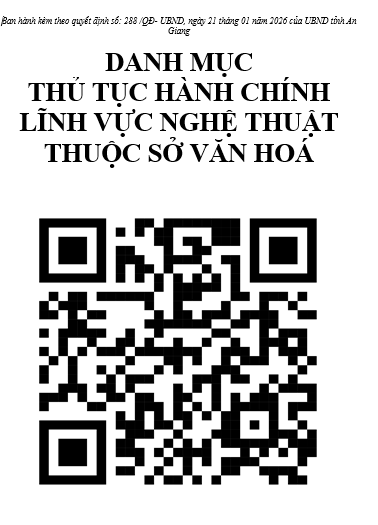 aA Danh mục Quyết định số 288/QĐ-UBND, ngày 21 tháng 01 năm 2026 của UBND tỉnh an giang về Danh mục TTHC Lĩnh vực Nghệ Thuật thuộc Sở Văn Hóa 03/02/2026, 17:03 Quay về Chia sẻ Z Copy link thành công Trung tâm phục vụ hành chính công Tin khác Quyết định số 488/QĐ-UBND, ngày 04 tháng 02 năm 2026 của UBND tỉnh an giang về Danh mục TTHC lĩnh vực Văn hóa Cơ sở về Di Sản Văn Hóa Danh mục 21/02/2026 Quyết định số 523/QĐ-UBND, ngày 06 tháng 02 năm 2026 của UBND tỉnh an giang về Danh mục TTHC mới ban hành lĩnh vực Di Sản Văn Hóa thuộc Sở Du Lịch Danh mục 21/02/2026 Quyết định số 521/QĐ-UBND, ngày 05 tháng 02 năm 2026 của UBND tỉnh an giang về Danh mục TTHC lĩnh vực Du Lịch sửa đổi bổ sung thuộc sở Du Lịch Danh mục 21/02/2026 Quyết định số 521/QĐ-UBND, ngày 06 tháng 02 năm 2026 của UBND tỉnh an giang về việc Danh mục TTHC mới ban hành lĩnh vực Việc Làm Danh mục 20/02/2026 Quyết định số 473/QĐ-UBND, ngày 04 tháng 02 năm 2026 của UBND tỉnh an giang Danh mục 20/02/2026 Quyết định số 478/QĐ-UBND, ngày 04 tháng 02 năm 2026 của UBND tỉnh an giang về Danh mục TTHC về lĩnh vực Nộ bộ mới ban hành bị bãi bỏ giữa Cơ quan HCC - NN Danh mục 20/02/2026 Quyết định số 472/QĐ-UBND, ngày 04 tháng 02 năm 2026 của UBND tỉnh an giang về Danh Mục TTHC Lĩnh vực hoạt động Doanh Nghiệp Danh mục 20/02/2026 Quyết định số 263/QĐ-UBND, ngày 19 tháng 01 năm 2026 của UBND tỉnh an giang về Danh Mục TTHC Lĩnh Vực thủy sản và kiểm ngư thuộc sở NN và MT Danh mục 03/02/2026 Quyết định số 208/QĐ-UBND, ngày 14 tháng 01 năm 2026 của UBND tỉnh an giang về Danh mục TTHC Lĩnh Vực viện trợ không hoàn lại thuộc sở tài chính Danh mục 03/02/2026 Quyết định số 312/QĐ-UBND, ngày 22 tháng 01 năm 2026 của UBND tỉnh an giang về Danh mục TTHC Lĩnh vực Thuế thuộc Sở Tài Chính Danh mục 03/02/2026 /quyet-dinh-so-288qd-ubnd-ngay-21-thang-01-nam-2026-cua-ubnd-tinh-an-giang-ve-danh-muc-tthc-linh-vuc-nghe-thuat-thuoc-so-van-hoa