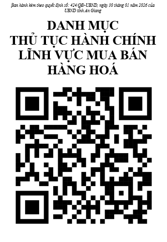 aA Danh mục Quyết định số 424/QĐ-UBND, ngày 30 tháng 01 năm 2026 của UBND tỉnh an giang về Danh Mục TTHC Lĩnh vực mua bán Hàng Hóa 03/02/2026, 17:09 Quay về Chia sẻ Z Copy link thành công Trung tâm phục vụ hành chính công Tin khác Quyết định số 488/QĐ-UBND, ngày 04 tháng 02 năm 2026 của UBND tỉnh an giang về Danh mục TTHC lĩnh vực Văn hóa Cơ sở về Di Sản Văn Hóa Danh mục 21/02/2026 Quyết định số 523/QĐ-UBND, ngày 06 tháng 02 năm 2026 của UBND tỉnh an giang về Danh mục TTHC mới ban hành lĩnh vực Di Sản Văn Hóa thuộc Sở Du Lịch Danh mục 21/02/2026 Quyết định số 521/QĐ-UBND, ngày 05 tháng 02 năm 2026 của UBND tỉnh an giang về Danh mục TTHC lĩnh vực Du Lịch sửa đổi bổ sung thuộc sở Du Lịch Danh mục 21/02/2026 Quyết định số 521/QĐ-UBND, ngày 06 tháng 02 năm 2026 của UBND tỉnh an giang về việc Danh mục TTHC mới ban hành lĩnh vực Việc Làm Danh mục 20/02/2026 Quyết định số 473/QĐ-UBND, ngày 04 tháng 02 năm 2026 của UBND tỉnh an giang Danh mục 20/02/2026 Quyết định số 478/QĐ-UBND, ngày 04 tháng 02 năm 2026 của UBND tỉnh an giang về Danh mục TTHC về lĩnh vực Nộ bộ mới ban hành bị bãi bỏ giữa Cơ quan HCC - NN Danh mục 20/02/2026 Quyết định số 472/QĐ-UBND, ngày 04 tháng 02 năm 2026 của UBND tỉnh an giang về Danh Mục TTHC Lĩnh vực hoạt động Doanh Nghiệp Danh mục 20/02/2026 Quyết định số 263/QĐ-UBND, ngày 19 tháng 01 năm 2026 của UBND tỉnh an giang về Danh Mục TTHC Lĩnh Vực thủy sản và kiểm ngư thuộc sở NN và MT Danh mục 03/02/2026 Quyết định số 208/QĐ-UBND, ngày 14 tháng 01 năm 2026 của UBND tỉnh an giang về Danh mục TTHC Lĩnh Vực viện trợ không hoàn lại thuộc sở tài chính Danh mục 03/02/2026 Quyết định số 312/QĐ-UBND, ngày 22 tháng 01 năm 2026 của UBND tỉnh an giang về Danh mục TTHC Lĩnh vực Thuế thuộc Sở Tài Chính Danh mục 03/02/2026 /quyet-dinh-so-424qd-ubnd-ngay-30-thang-01-nam-2026-cua-ubnd-tinh-an-giang-ve-danh-muc-tthc-linh-vuc-mua-ban-hang-hoa